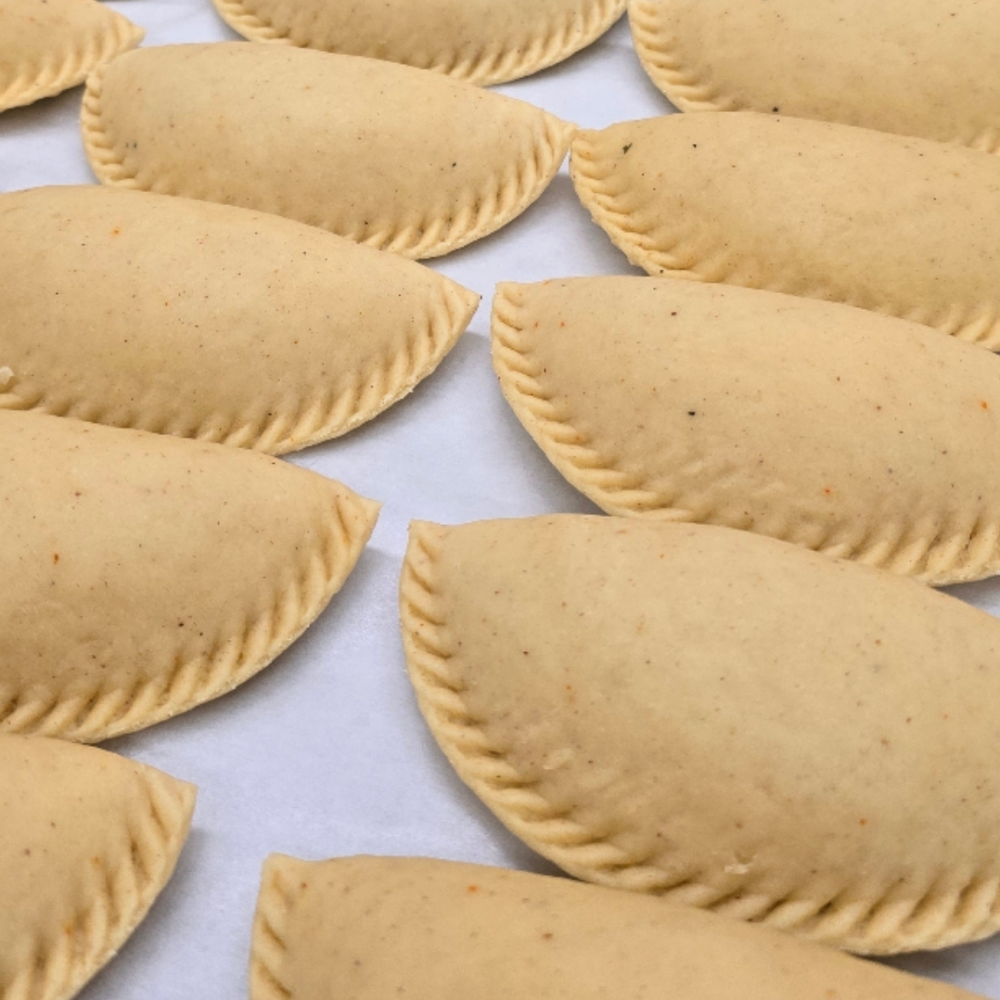 The beef pies are filled with a hearty mixture of beef, potatoes, carrots, green peas, and seasonings (including seasoning, curry powder, dried thyme, and nutmeg.